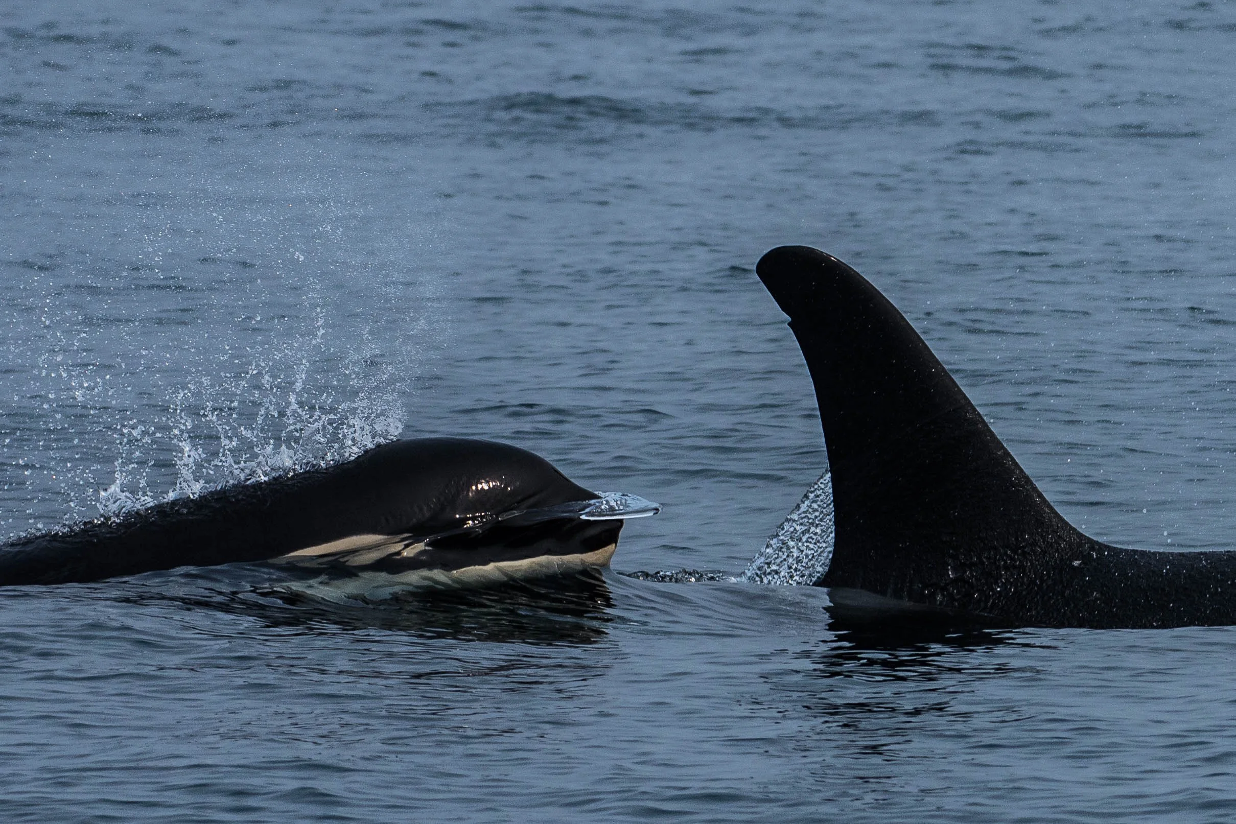 A pod of orca whales stay close to one another as they navigate the golf of Alaska.