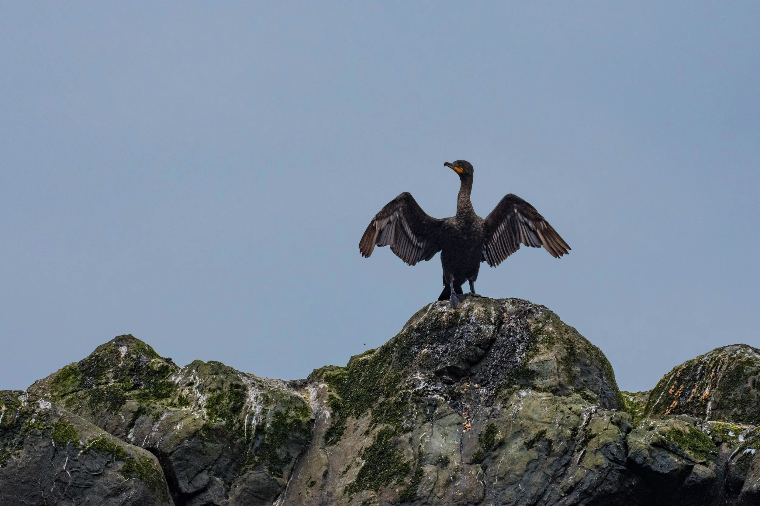 July 26th 2019 a cormorant is perched on a rock in the golf of Alaska. Its wings are spread because cormorants air dry them after they dive into the ocean. View fullsize