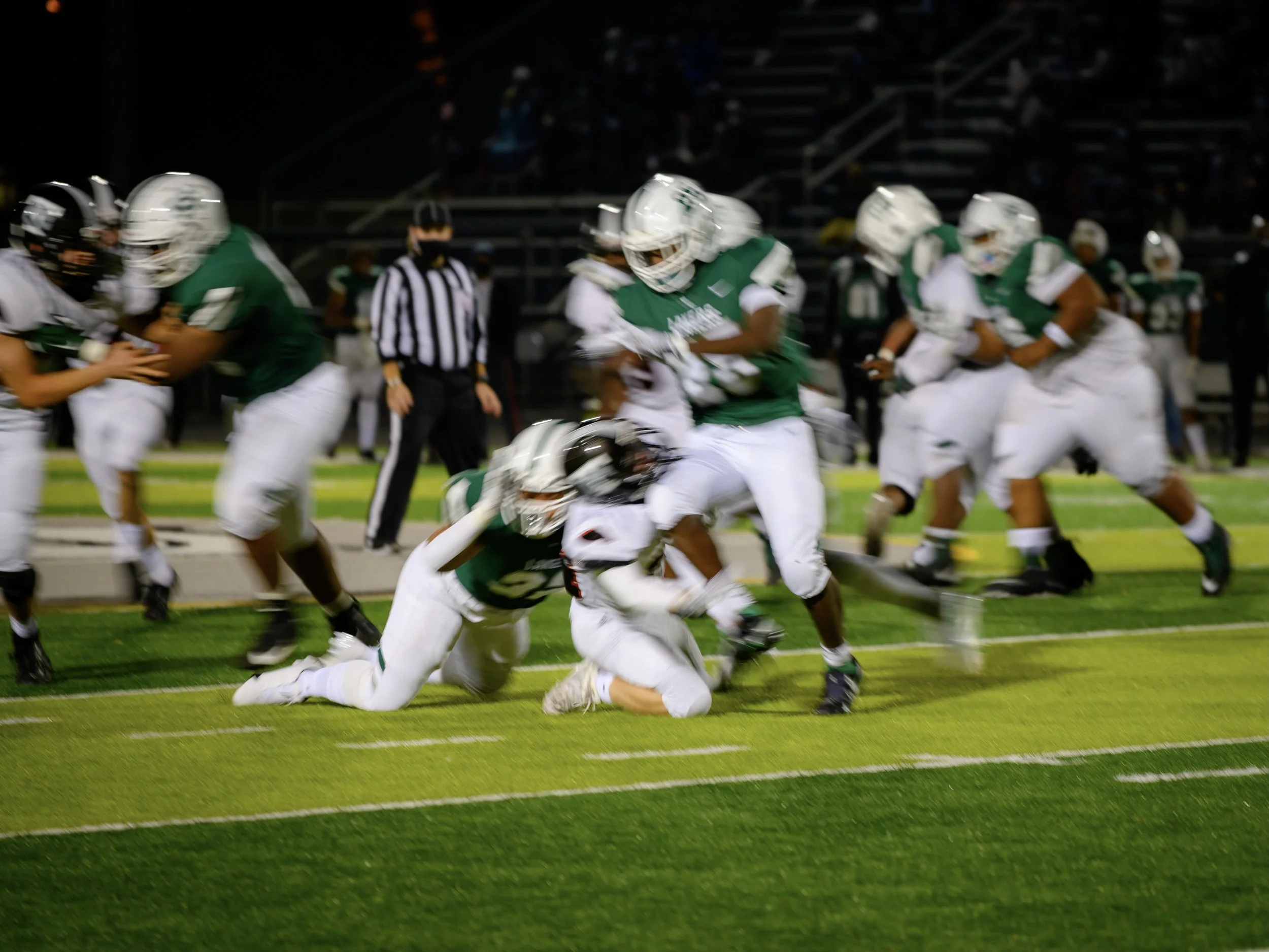 Troy Colts football player gets caught between two members of the opposing team. View fullsize