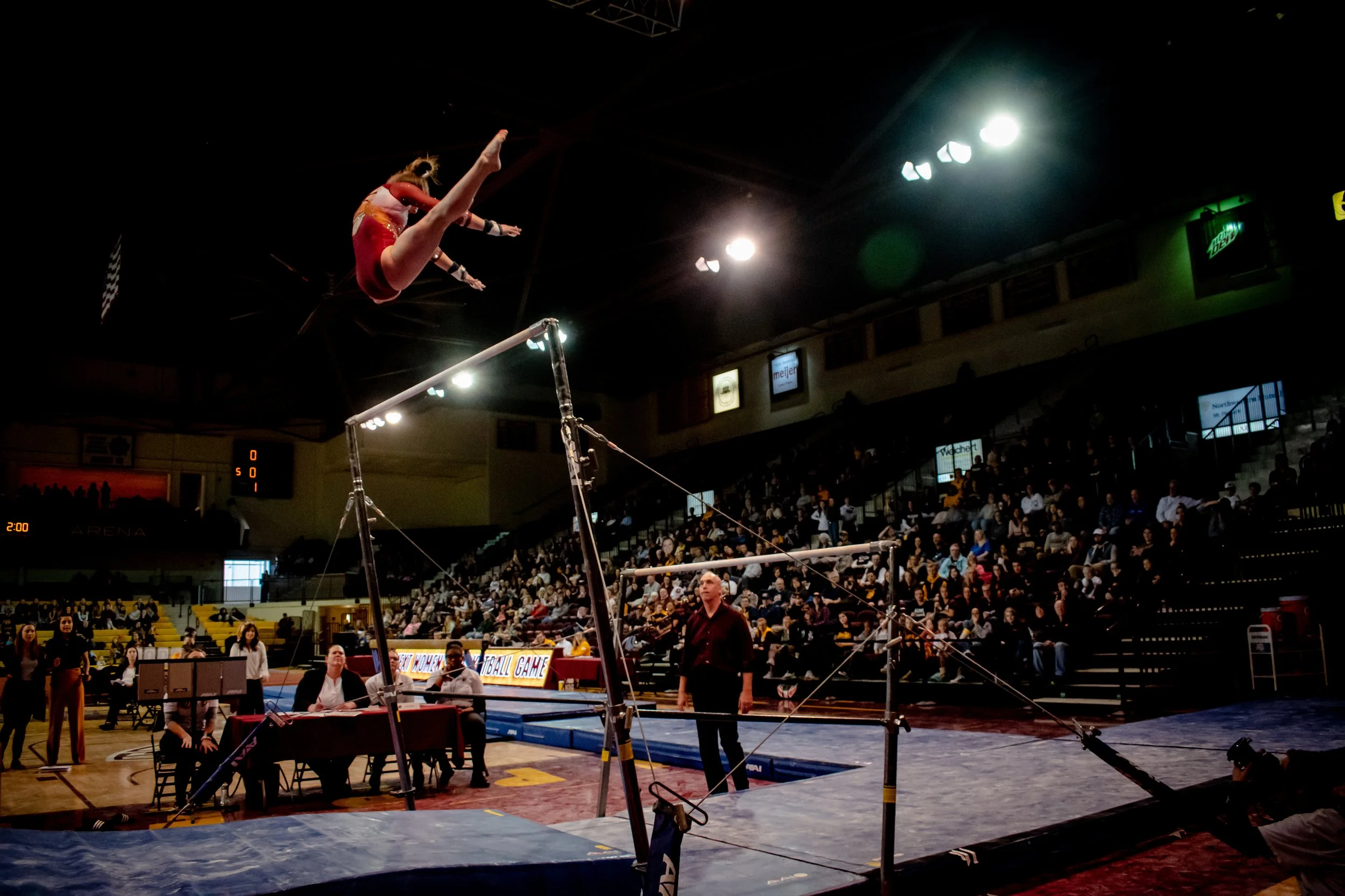 February 2020 Casey Andrews a Central Michigan University Gymnast preforms on the high low bars in font of the judges her coach and the audience. Little does anyone know this will be the last meet before the 2020 Covid 19 outbreak and lockdown.