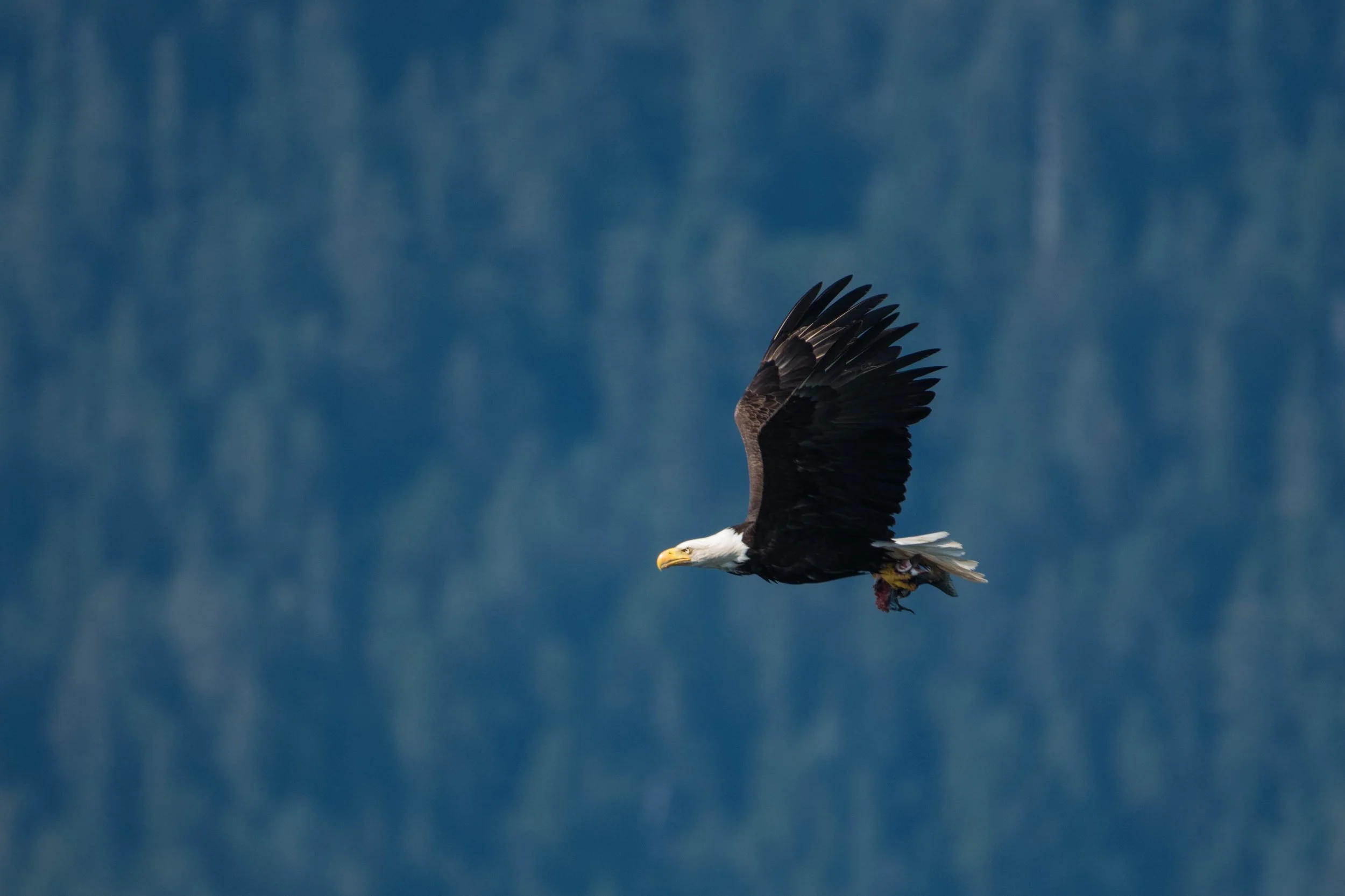 July 28th 2019 a bald eagle flys over Seward Alaska with a freshly caught fish in its talons.