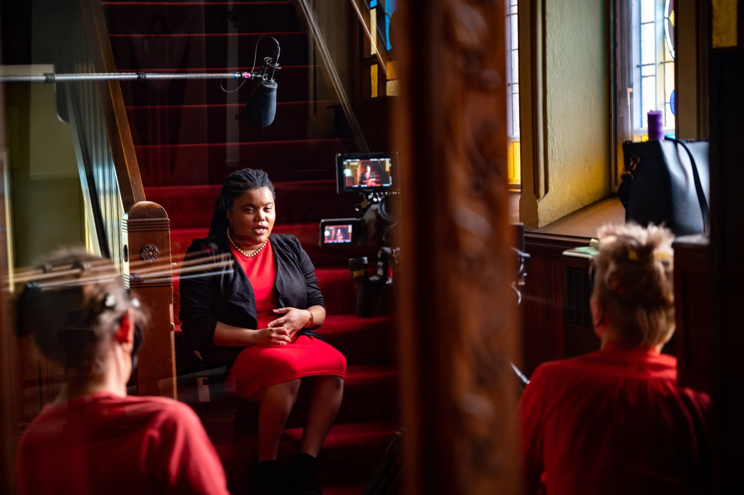 Susan Brooks interviews for a documentary about the tax on tampons in Ann Arbor Michigan.